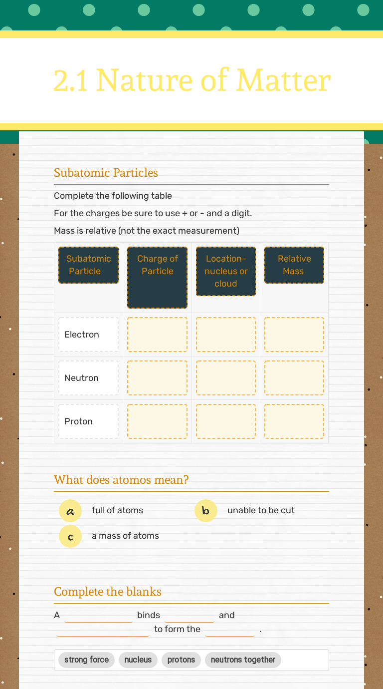 But all matter does this in four different ways. Explain how all of the isotopes of an element are . A brilliant way to build ks3 chemistry . Identify the three subatomic particles found in atoms. Scientific models are simplified but useful representations of something real. Worksheet c1a.2a the particulate nature of matter. Solid, liquid, gas, and plasma. Discoveries about the nature of the atom. Refer to the particle arrangements in solids, . Based on your knowledge, describe what an atom is. Worksheets, activities, and experiments for teaching the three basic states of matter (solids, liquids, and gases). Explain properties of the three states of matter giving examples of each. Nature of matter worksheet is for practicing proprties of matter.